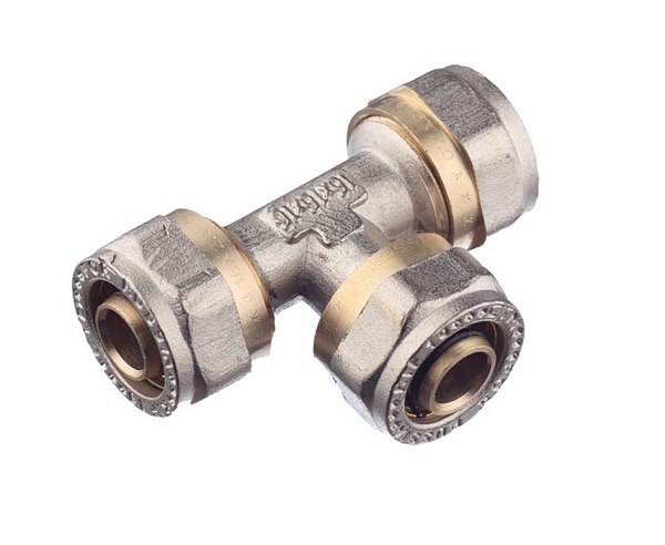Тройник для металлопластика обжим 20 х 20 х 20мм - применятся для соединения трёх металлопластиковых труб одинакового диаметра (20 мм) методом обжима. С помощью такого тройника поток воды разделяется на два направления