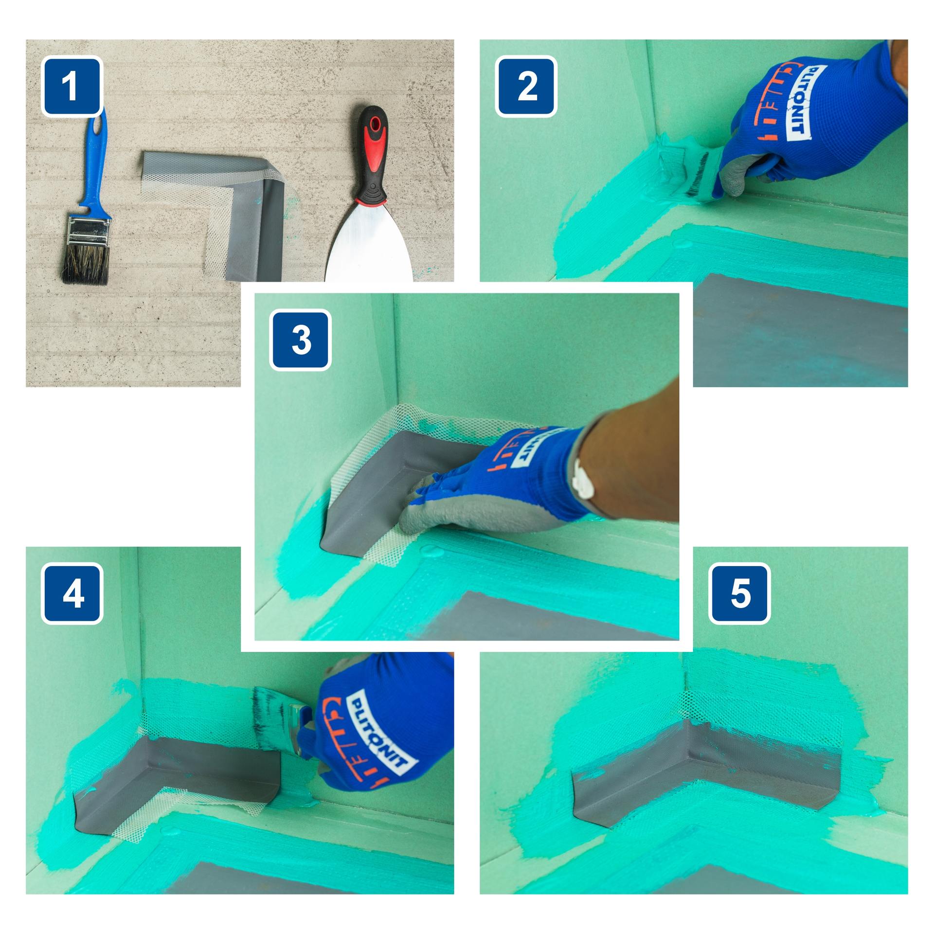 Нанесите на обрабатываемую поверхность слой гидроизоляционного состава (например, в линейке PLITONIT вы найдете мастики PLITONIT ГидроЭласт, PLITONIT WaterProof Premium). Вдавите в него угловой элемент гладким металлическим (пластиковым) шпателем или валиком, чтобы удалить все воздушные «пузыри». Следующий слой гидроизоляционного состава наносят поверх сечтатой части угла. Угловой элемент стыкуется с гидроизоляционной лентой гидроизоляционным составом внахлест на 5 см: сначала укладывается угол, на него сверху накладывается лента. Внутренний и внешний углы представляют собой эластомер, нанесенный на полиэфирную сетку.