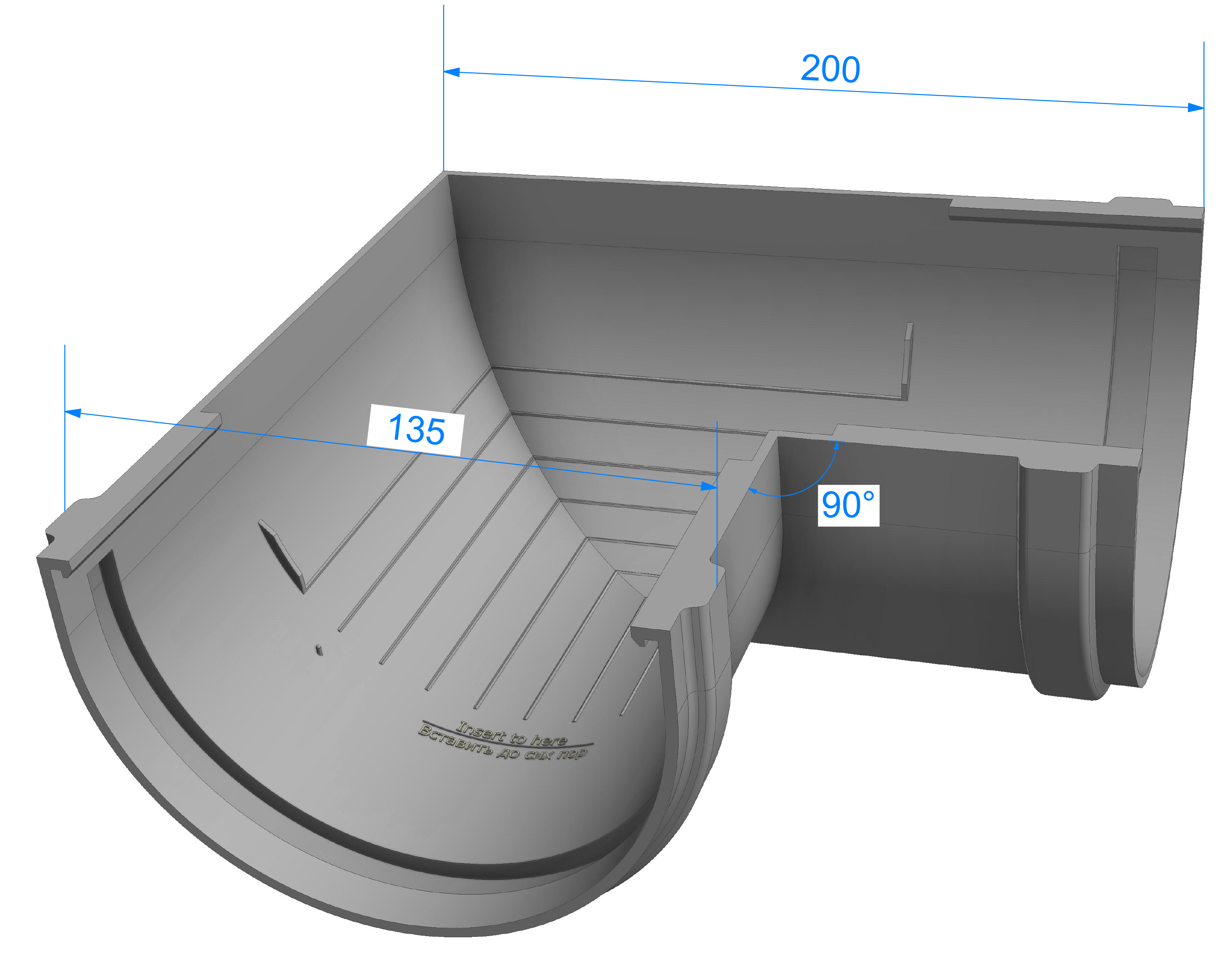 Угловой элемент желоба устанавливается на внутренних и внешних углах кровли и предназначен для соединения желобов под углом 90 градусов для изменения направления движения воды.