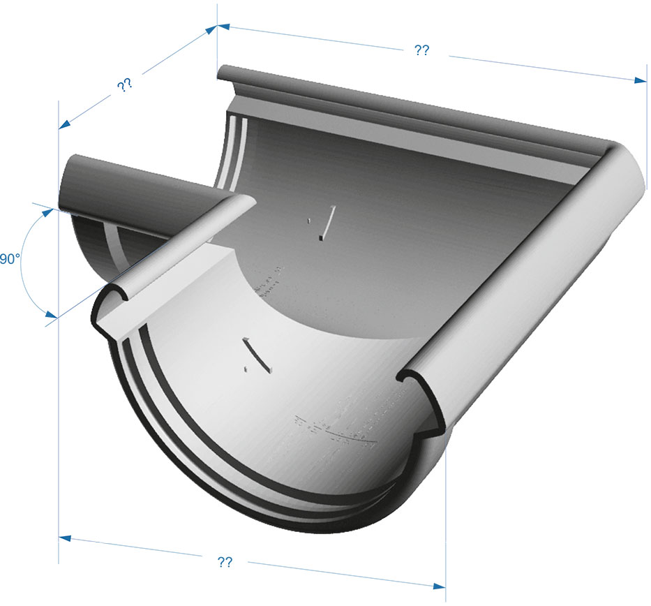 Угловой элемент желоба устанавливается на внутренних и внешних углах кровли и предназначен для соединения желобов под углом 90 градусов для изменения направления движения воды.