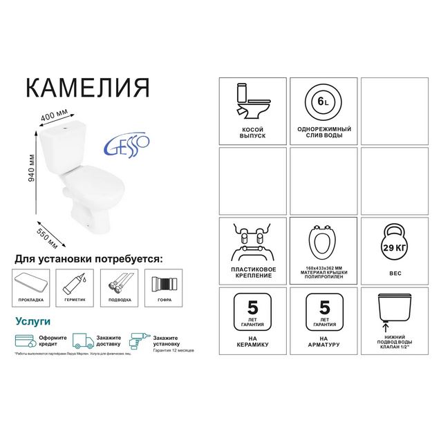 Унитаз-компакт Камелия косой выпуск нижняя подводка с сиденьем