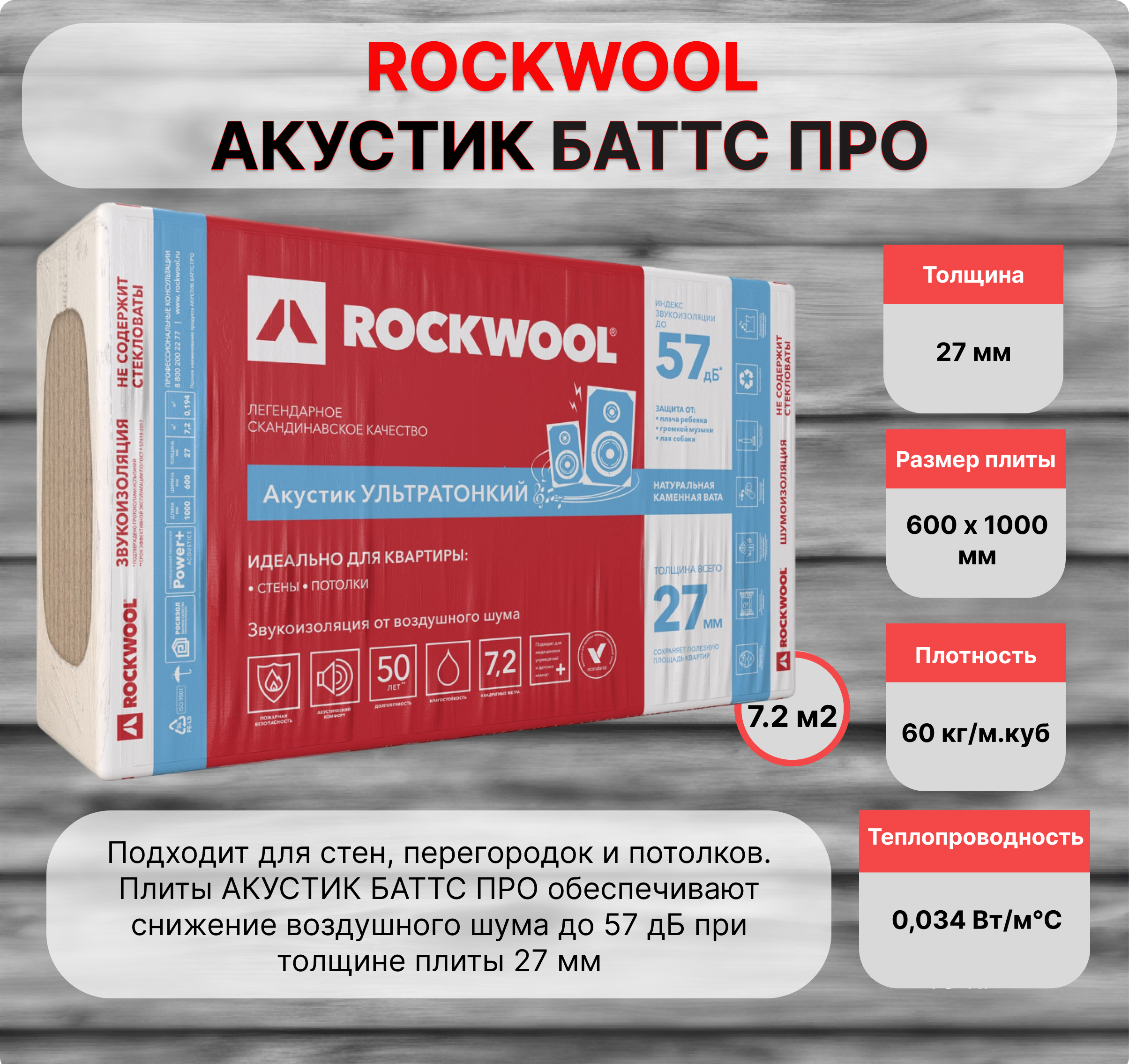 Плиты из каменной ваты ROCKWOOL Акустик УЛЬТРАТОНКИЙ* (АКУСТИК БАТТС ПРО) – это звукопоглощающий материал для дополнительной звукоизоляции существующих стен и потолка, который удобно использовать в конструкции, возводимой в условиях ограниченного пространства, ведь его толщина всего 27 мм.
