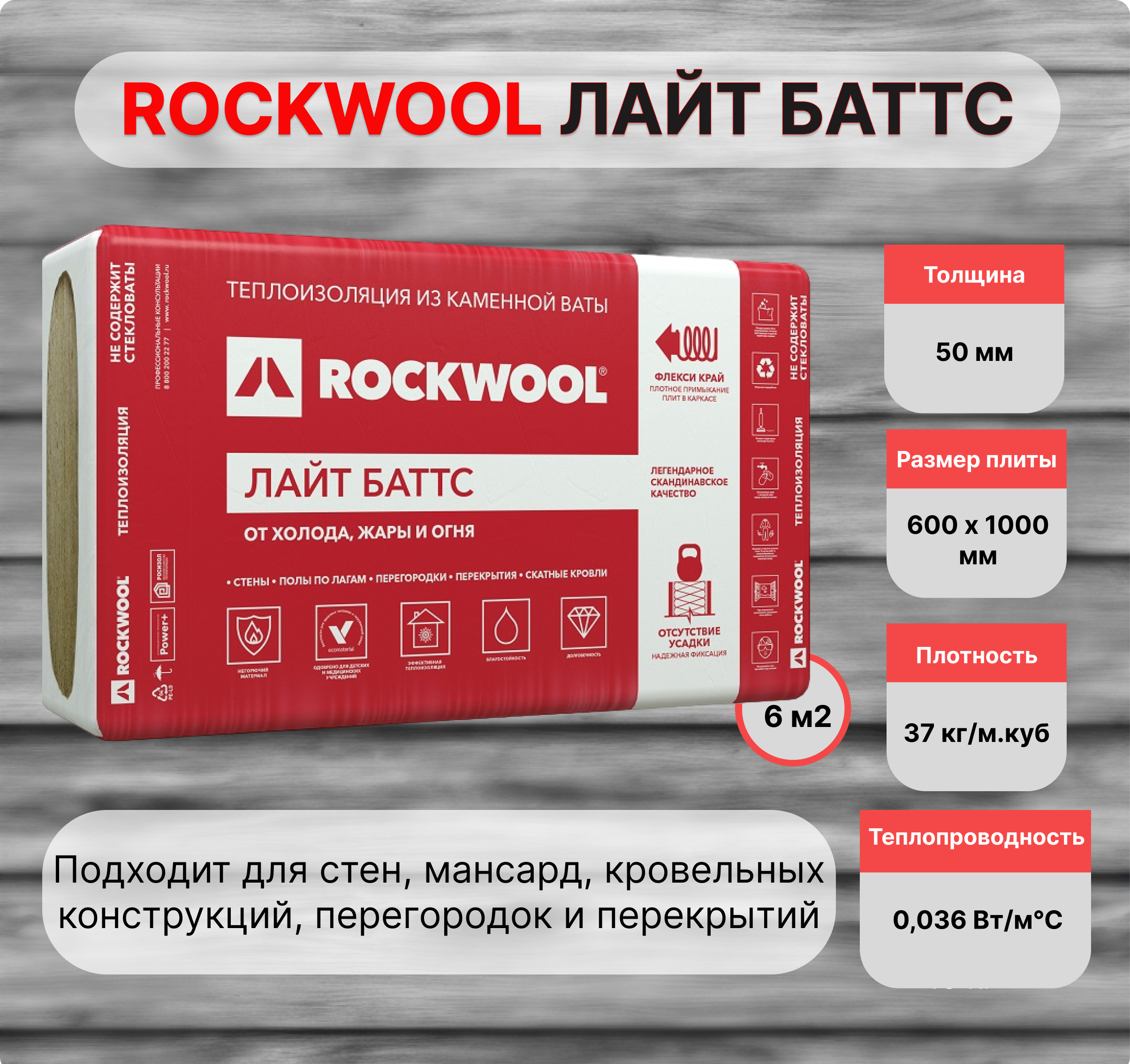Вата базальтовая Rockwool Лайт Баттс 50 х 600 х 1000 мм 6 кв.м