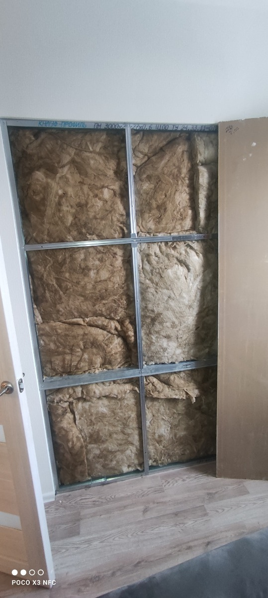Делали звукоизоляцию межквартирных перегородок. Дом новый, через стены слышно практически все, что делают соседи. Все стены обшили ватой теплые стены. В квартире стало гораздо тише. Соседей слышно, только когда они очень сильно шумят. Материалом остались довольны.