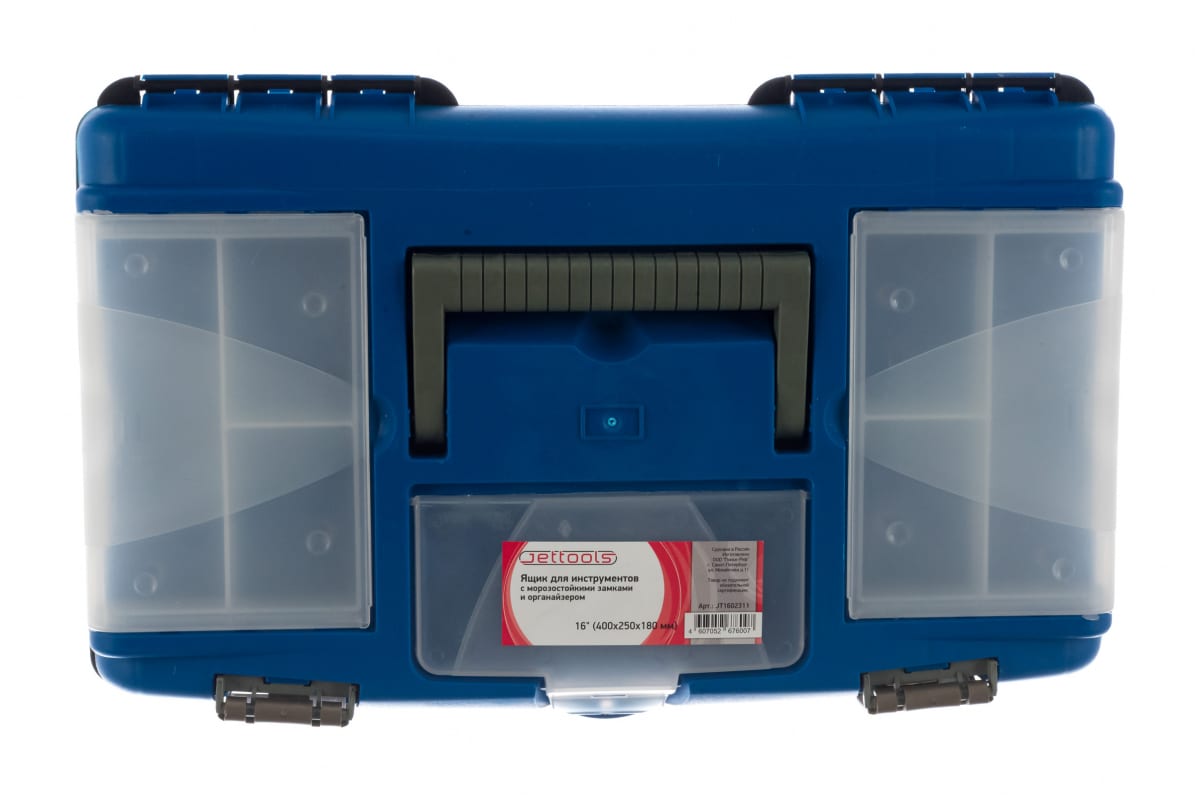 Ящик для инструментов Jettools оснащен морозостойкими замками, органайзером и ручкой для удобства переноски.