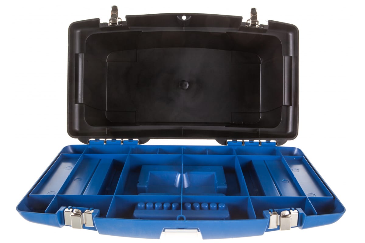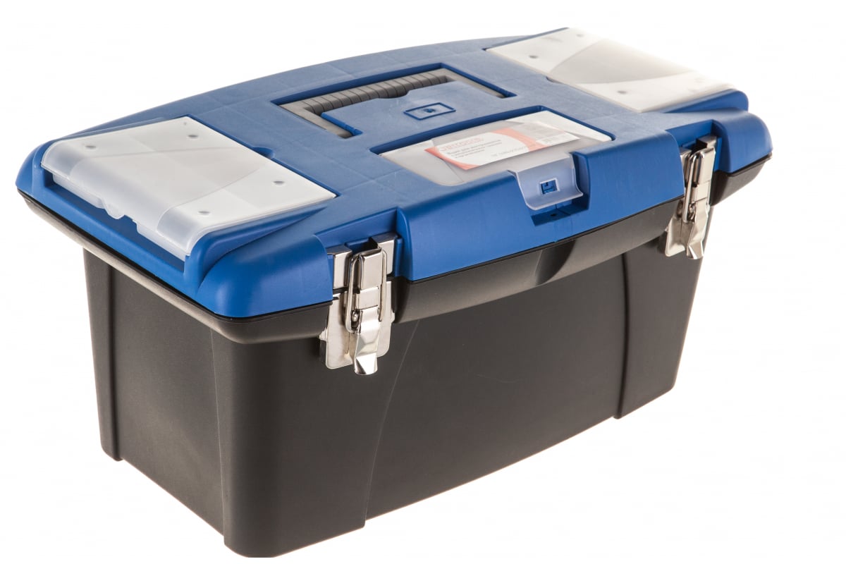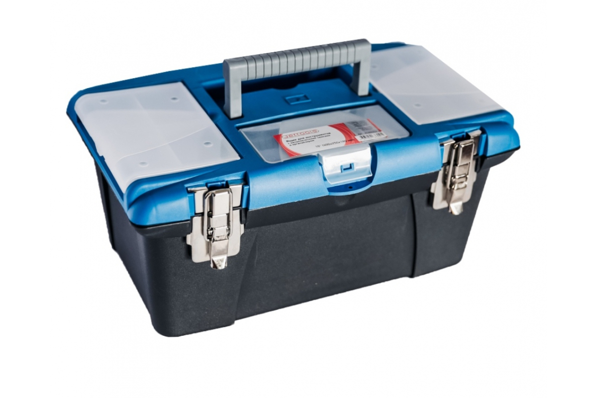 Ящик для инструментов Jettools оснащен двумя металлическими замками, органайзером и ручкой для удобства переноски.