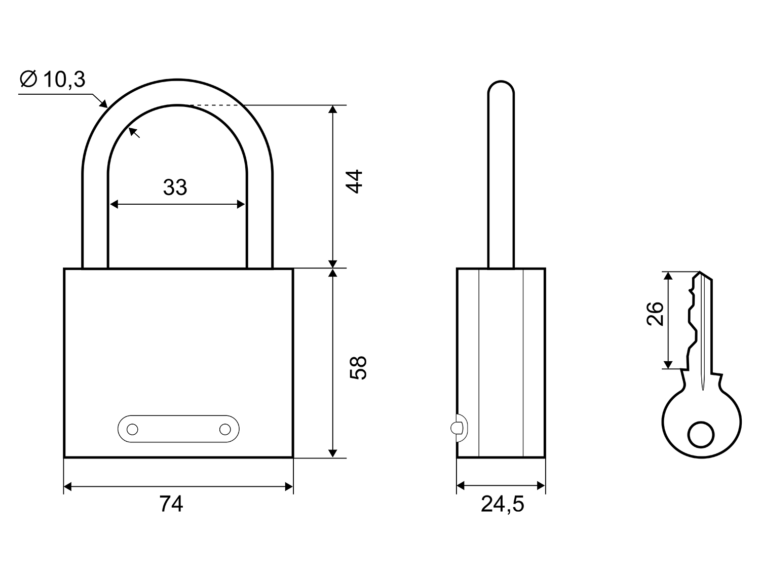 Большой размер, толстая дужка. Корпус 74 x 58 x 24,5, душка 10,3 мм. Габариты этой модели замка делают ее стойкой к взломам. Это идеальный выбор для дачных домиков, дверей подсобных помещений, дверей складов, подвалов и других промышленных и бытовых зданий.