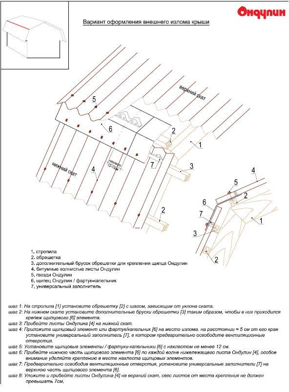 Устанавливается в просветы между обрешеткой и кровельными листами Ондулин на карнизе или между листами и коньковым элементом на хребте кровли. В зависимости от того, нужна ли вентиляция или тотальная защита, заполнитель можно делать вентилируемым или невентилируемым: для этого предусмотрены специальные отверстия, которые в случае необходимости освобождаются обычной отверткой.