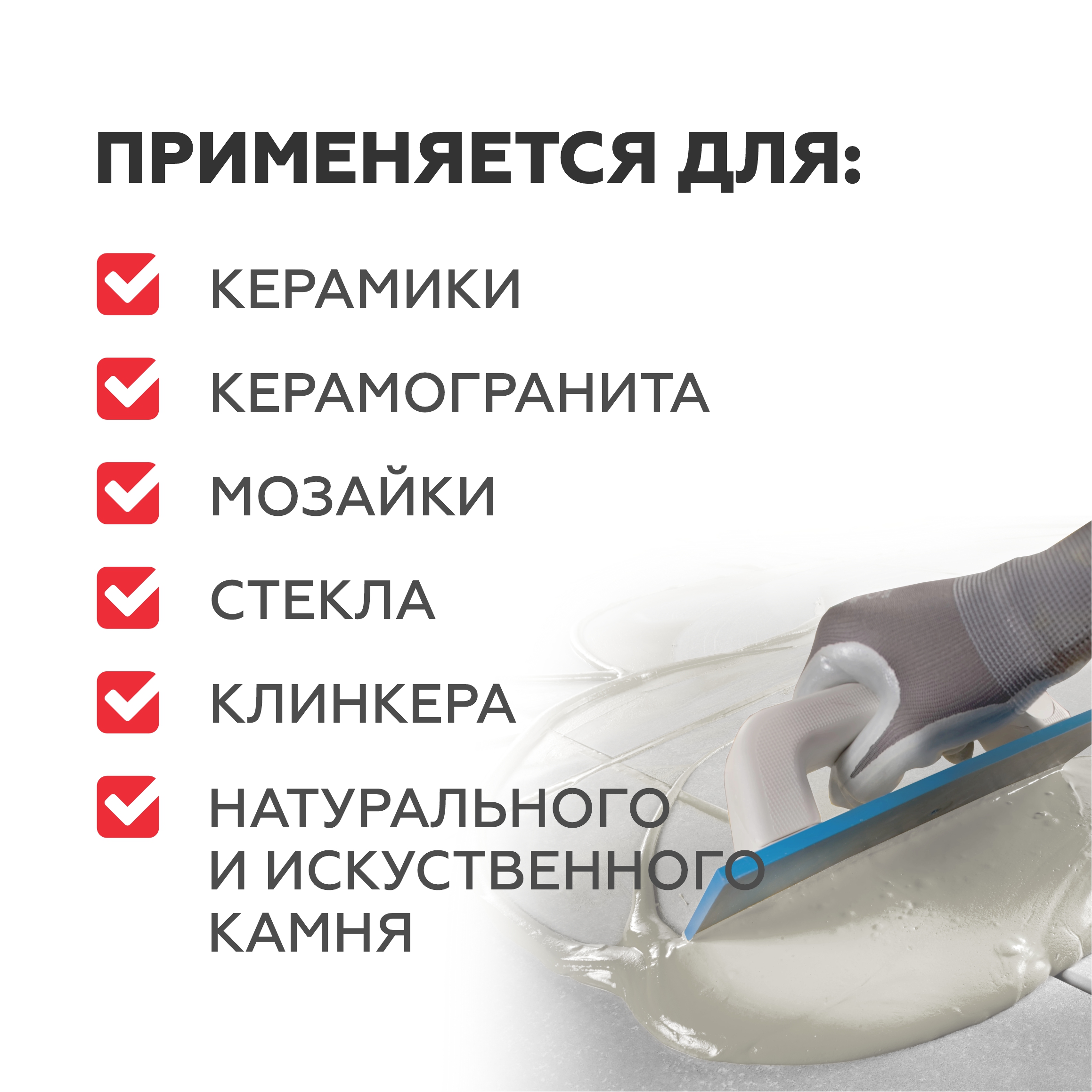 Смесь предназначена для затирки швов облицовочной настенной и напольной плитки из керамики, керамогранита, клинкера, мозаичной и стеклянной плитки, натурального и искусственного камня при внутренних и наружных работах. Применяется при строительстве и ремонте жилых и общественных зданий и сооружений, в том числе учебно-воспитательных заведениях, детских, дошкольных, школьных и медицинских учреждениях (в т.ч. лечебно-профилактических и санаторно-курортных).