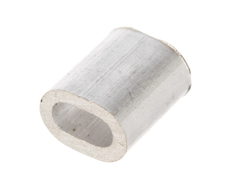 Алюминиевый зажим для троса закрепляет трос методом обжатия. Представляет собой отрезок алюминиевой трубки с толстыми стенками. Установка данного зажима осуществляется двумя способами: первый способ - это ударное сплющивание, например, с помощью молотка, а второй способ - это сплющивание силой нажима.