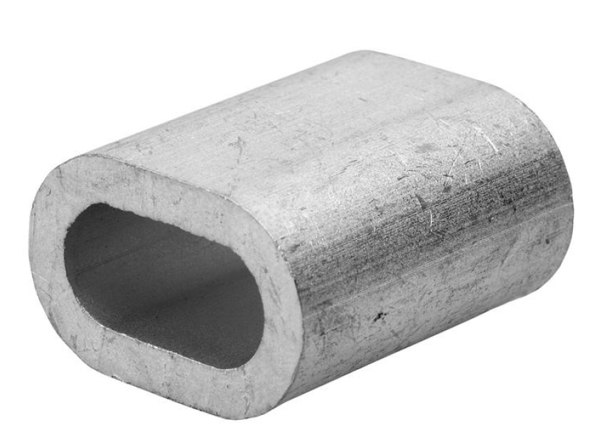 Алюминиевый зажим для троса закрепляет трос методом обжатия. Представляет собой отрезок алюминиевой трубки с толстыми стенками. Установка данного зажима осуществляется двумя способами: первый способ - это ударное сплющивание, например, с помощью молотка, а второй способ - это сплющивание силой нажима.