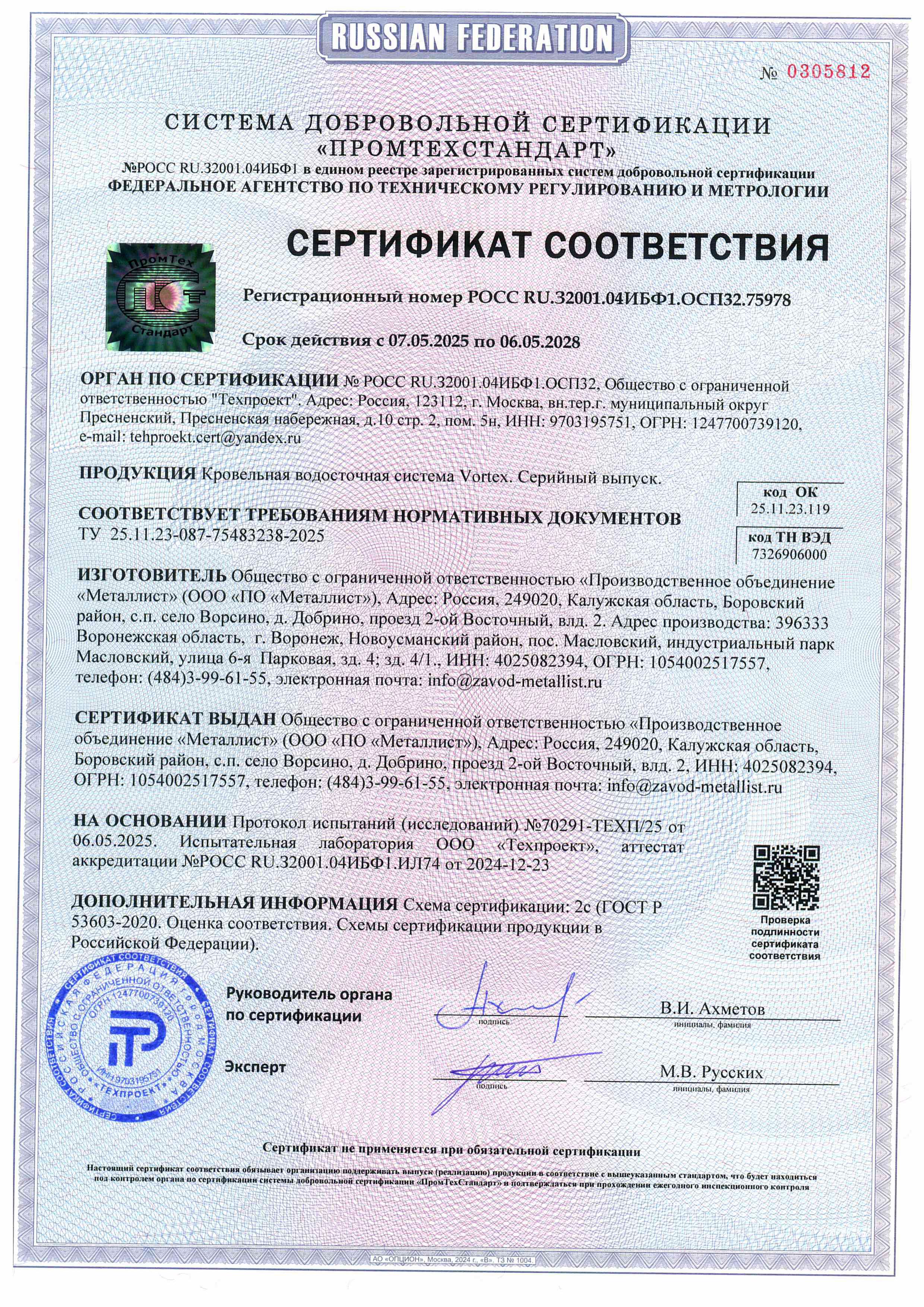 Желоб системы Vortex предназначен для сбора и организованного отвода осадков с поверхности кровли. Для его надежного монтажа и обеспечения правильного тока воды используются крюки с шагом 60-90 см, которые создают необходимый уклон (5 мм/метр).