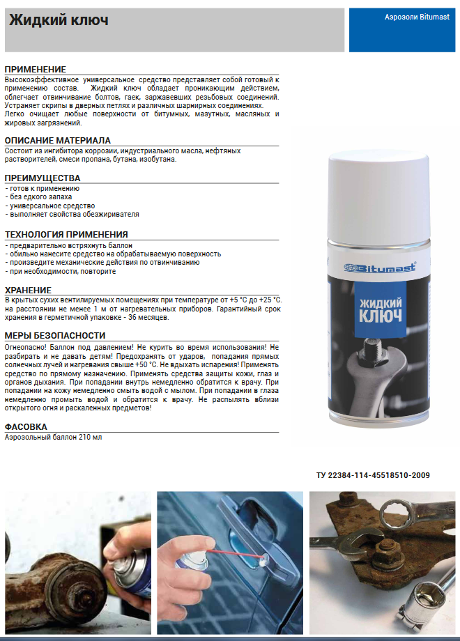 Жидкий ключ Битумаст - эффективное универсальное средство. Представляет собой готовый к применению состав. Преимущества: Технология применения: - предварительно встряхнуть баллон Меры безопасности: Огнеопасно! Баллон под давлением! Не курить во время использования! Не разбирать и не давать детям! Предохранять от ударов, попадания прямых солнечных лучей и нагревания свыше +50 °С. Не вдыхать испарения! Применять средство по прямому назначению. Применять средства защиты кожи, глаз и органов дыхания. При попадании внутрь немедленно обратится к врачу. При попадании на кожу немедленно смыть водой с мылом. При попадании в глаза немедленно промыть водой и обратится к врачу. Не распылять вблизи открытого огня и раскаленных предметов!